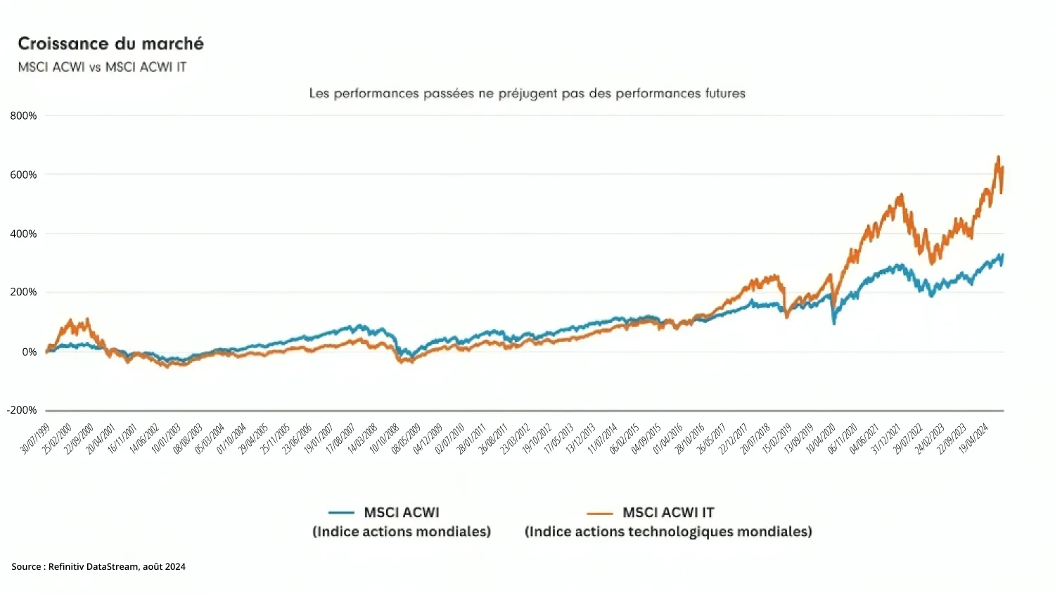 L’investissement dans la tech s’est généralisé et ne se limite plus aux grands noms américains. D’une part, comme le montre le graphique ci-dessous, la croissance du marché technologique mondial a dépassé en valeur celle du marché mondial dans son ensemble au cours des 25 dernières années.