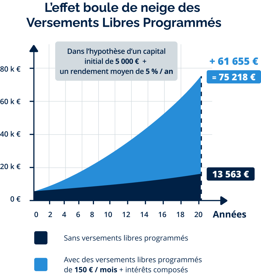 En mettant en place des versements libres programmés sur votre contrat PER, vous profitez de l’effet boule de neige des versements libres programmés. Vous bénéficiez des intérêts composés qui amplifient la croissance de votre épargne.
