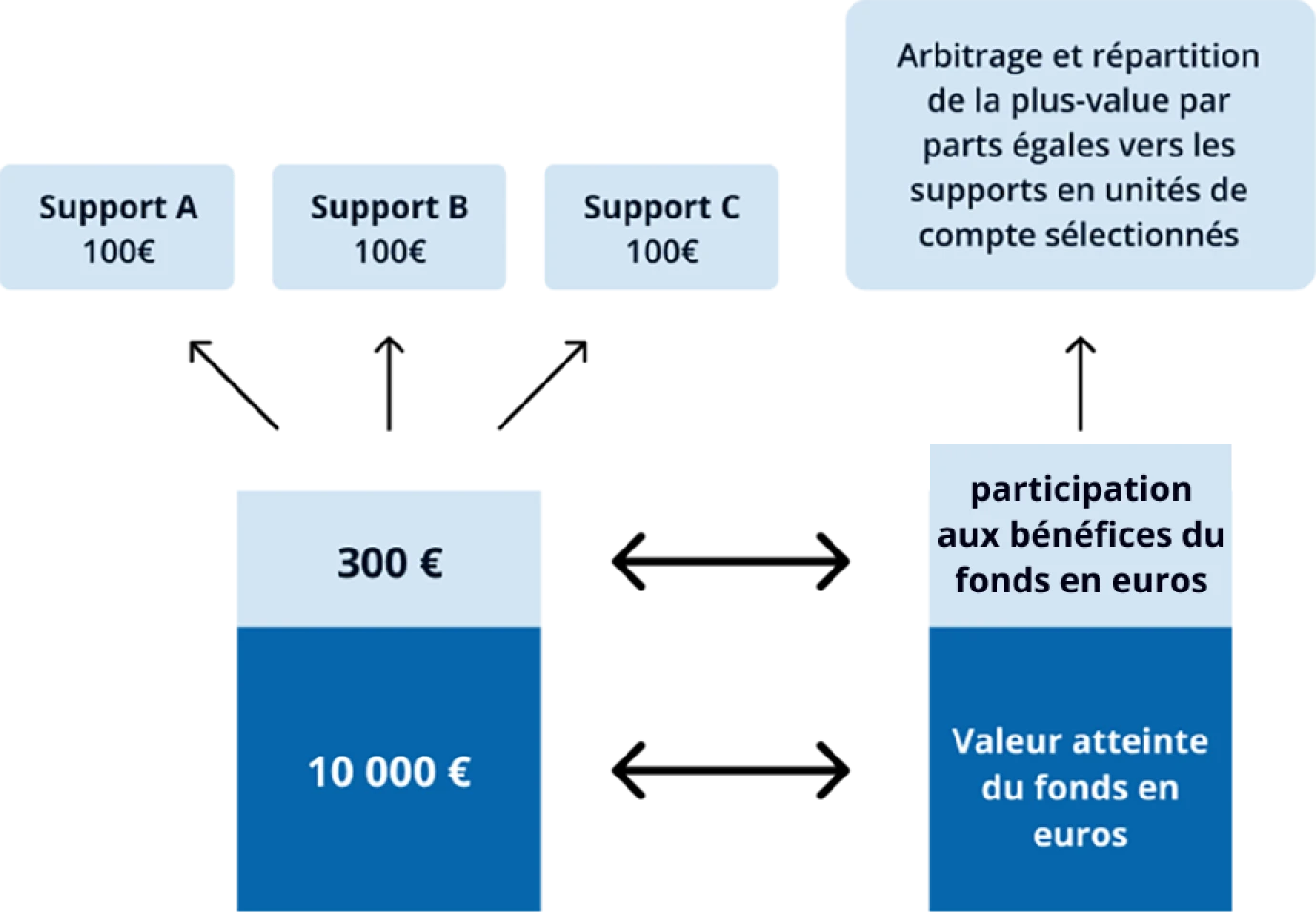 Cette option permet de transférer automatiquement des fonds d'un investissement à un autre selon des critères prédéfinis. Ce mécanisme est utilisé pour optimiser potentiellement la performance d'un portefeuille en ajustant régulièrement la répartition des actifs. L'arbitrage programmé offre une gestion proactive et automatisée, réduisant le besoin d'interventions manuelles fréquentes. Chaque arbitrage réalisé dans le cadre de l’exécution de l’option arbitrages programmés ne supporte aucuns frais. L'arbitrage peut s'effectuer hebdomadairement, mensuellement ou trimestriellement, à partir du fonds en euros ou d’un support en unités de compte, d’un montant minimum de 100 euros vers un ou plusieurs supports en unités de compte sélectionnés.