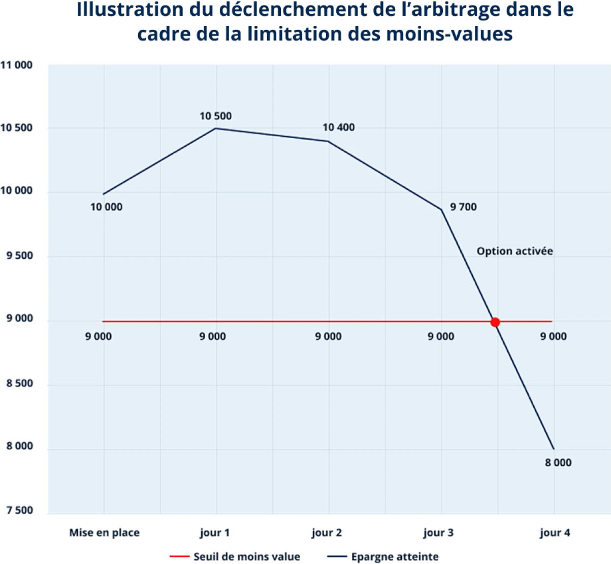 Cette option permet de limiter les pertes causées par une baisse de la valeur du ou des supports d'investissement sélectionnés. L’option se déclenche lorsqu'un certain pourcentage de baisse, défini à l'avance, est constaté par rapport au prix d'achat au moment de l’investissement. Lorsque l’option se déclenche, la totalité de la valeur atteinte du support est transférée vers le ou les support(s) de sécurisation(s) sélectionné(s). La constatation se fait le vendredi, l’assureur procédera à un arbitrage sans frais en date de valeur du lundi suivant la constatation. Par exemple, pour un investissement de 10 000 euros sur un support avec une option de limitation des moins-values de 10 %, aucun arbitrage n'est enclenché tant que la valeur du support reste au dessus de 9 000 €, car 10 000 - (10 000 * 10 %) = 9 000 €.